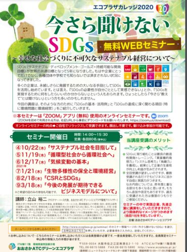 弊社はSDGsに取り組んでいます。 大阪府のSDGs推進を担当されている「おおさかATCグリーンエコプラザ」にも常設展示しています。 エコプラザカレッジ2020の後期がスタートしています。 テーマは『今さら聞けないSDGs~幸せな社会づくりに…