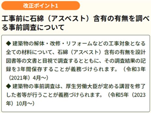 厚生労働省では、「石綿総合情報ポータルサイト」を準備して、石綿規制に関する様々な情報を提供しています。 www.ishiwata.mhlw.go.jp 法改正のポイントは5つあります。 第一は、「工事前に石綿(アスベスト)含有の有無を調べる事前調査について」です。 …