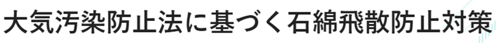 大気汚染防止法に基づき、特定建築材料(石綿を飛散させる原因となる建築材料)が使用されている建築物等の解体、改造、補修作業(以下「解体等⼯事」という。)を行う際には、石綿飛散防止対策(作業基準の遵守)が義務づけられています。