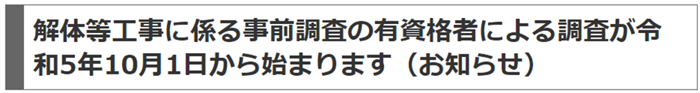 また、令和5年10月1日以降着工の解体等工事に係る事前調査は、事前調査を実施するために必要な知識を有する者として環境大臣が定める者(注3)が行う必要があります。