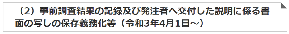 改正後の大気汚染防止法(以下「改正法」という。)では、事前調査手法が法定化され、調査結果の記録及び発注者へ交付した説明に係る書面の写しの保存が義務化されました。